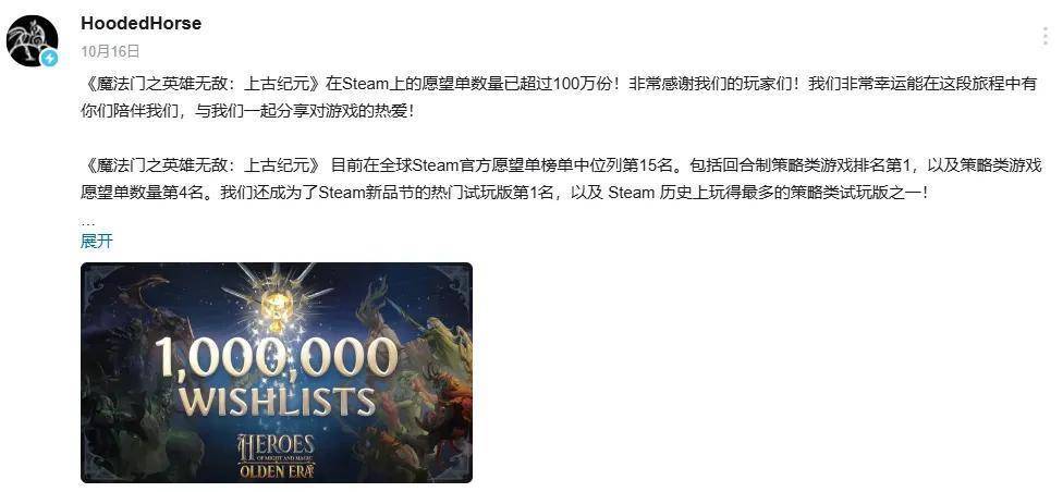不久前,发行商HoodedHorse公开了一个好消息:《魔法门之英雄无敌:上古纪元》的测试版获得了在Steam上的愿望单数量已超过100万份,也是本次Steam新品节的试玩第一名。