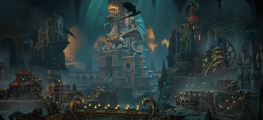 图为“上古纪元”中的“地牢”主城,作为以顶级单位“黑龙”闻名的阵营,主城也重点体现了龙这一要素